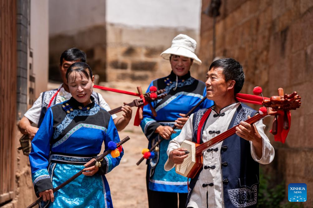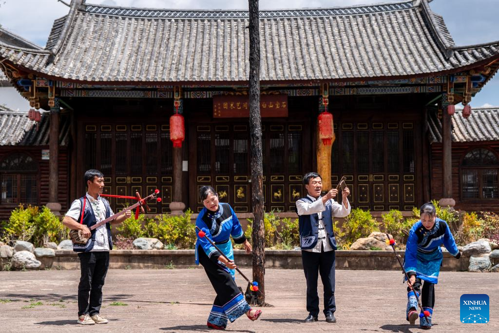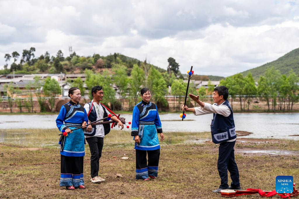 Jiang Wufa (2nd, R), an inheritor of arts for Shibaoshan Song Festival, a national intangible cultural heritage, rehearses with his apprentices in Shilong Village of Shaxi Town, Jianchuan County, southwest China's Yunnan Province, April 19, 2025. A remote town in Jianchuan County, Shaxi was once an important trading hub for tea, herbs, silks and salt on the ancient Tea Horse Road, a trade route dating back to the Tang Dynasty (618-907). (Xinhua/Hu Chao)