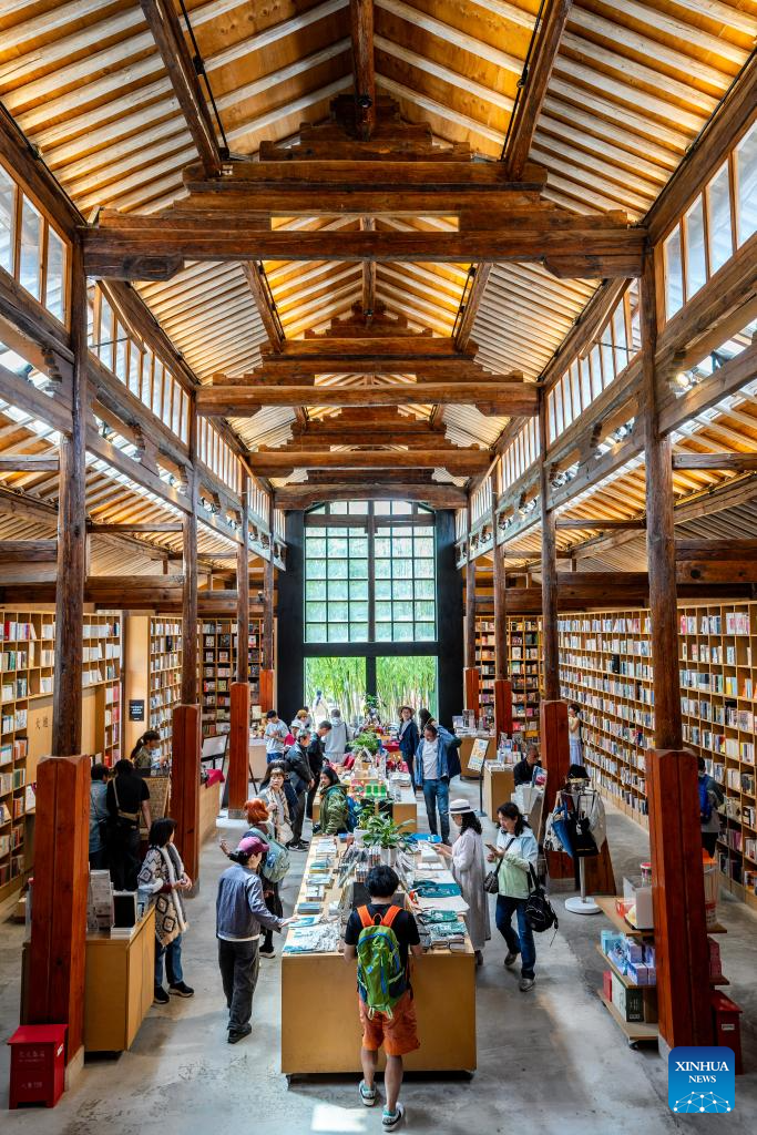 People visit a bookshop at Beilong Village of Shaxi Town, Jianchuan County, southwest China's Yunnan Province, April 20, 2025. A remote town in Jianchuan County, Shaxi was once an important trading hub for tea, herbs, silks and salt on the ancient Tea Horse Road, a trade route dating back to the Tang Dynasty (618-907). (Xinhua/Hu Chao)