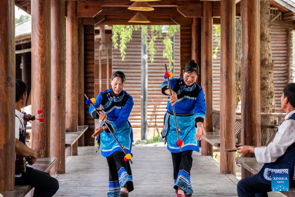 Villagers practice a folk dance in Shilong Village of Shaxi Town, Jianchuan County, southwest China's Yunnan Province, April 19, 2025. A remote town in Jianchuan County, Shaxi was once an important trading hub for tea, herbs, silks and salt on the ancient Tea Horse Road, a trade route dating back to the Tang Dynasty (618-907). (Xinhua/Hu Chao)