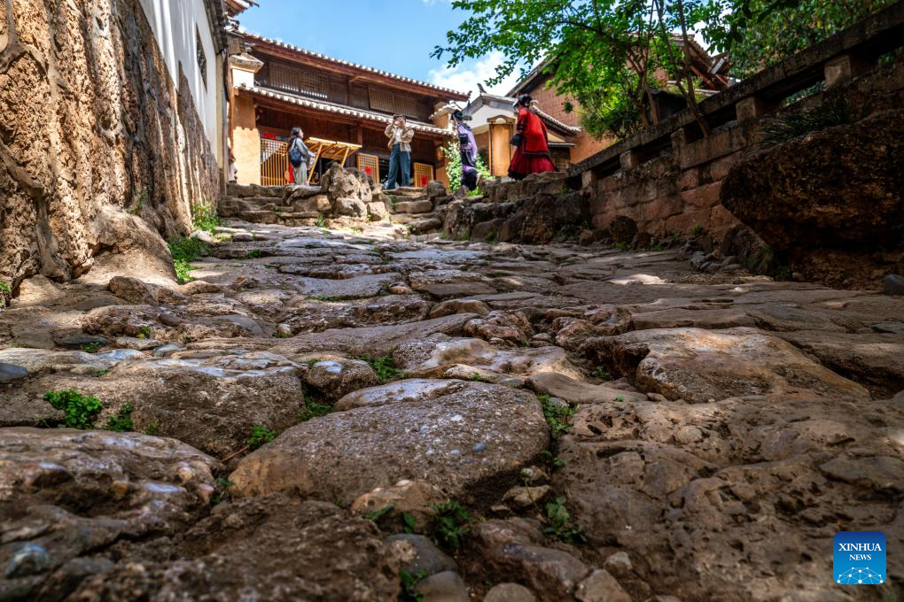 This photo taken on April 21, 2025 shows a section of the ancient Tea Horse Road at Sideng Village of Shaxi Town, Jianchuan County, southwest China's Yunnan Province. A remote town in Jianchuan County, Shaxi was once an important trading hub for tea, herbs, silks and salt on the ancient Tea Horse Road, a trade route dating back to the Tang Dynasty (618-907). (Xinhua/Hu Chao)