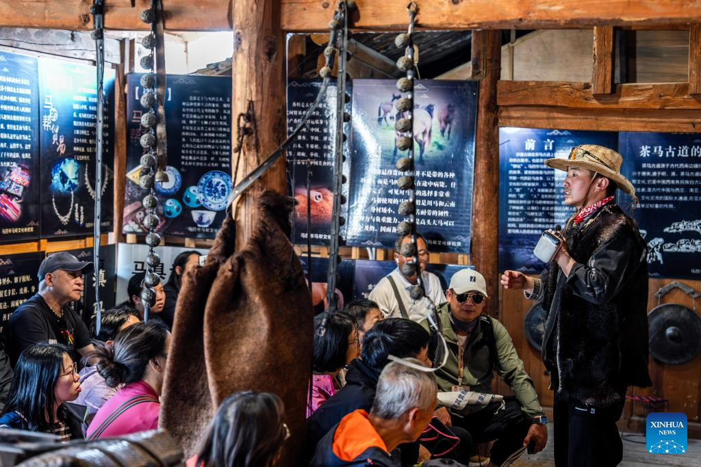 Yang Siyun (1st, R), a descendant of local horse train operators, tell stories of his ancestors to visitors at Sideng Village of Shaxi Town, Jianchuan County, southwest China's Yunnan Province, April 19, 2025. A remote town in Jianchuan County, Shaxi was once an important trading hub for tea, herbs, silks and salt on the ancient Tea Horse Road, a trade route dating back to the Tang Dynasty (618-907). (Xinhua/Liu Lianfen)