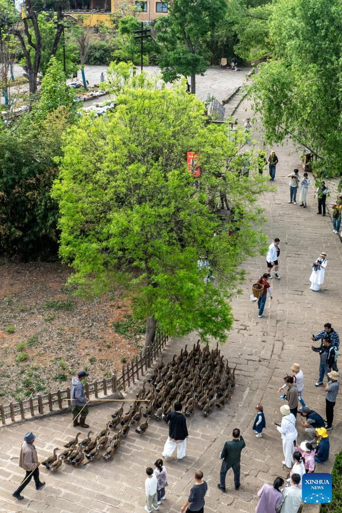 An aerial drone photo taken on April 19, 2025 shows villagers driving a flock of ducks at Sideng Village of Shaxi Town, Jianchuan County, southwest China's Yunnan Province. A remote town in Jianchuan County, Shaxi was once an important trading hub for tea, herbs, silks and salt on the ancient Tea Horse Road, a trade route dating back to the Tang Dynasty (618-907). (Xinhua/Hu Chao)