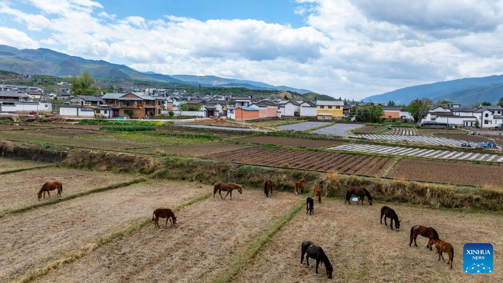 An aerial drone photo taken on April 20, 2025 shows horses foraging in the field at Sideng Village of Shaxi Town, Jianchuan County, southwest China's Yunnan Province. A remote town in Jianchuan County, Shaxi was once an important trading hub for tea, herbs, silks and salt on the ancient Tea Horse Road, a trade route dating back to the Tang Dynasty (618-907). (Xinhua/Liu Lianfen)