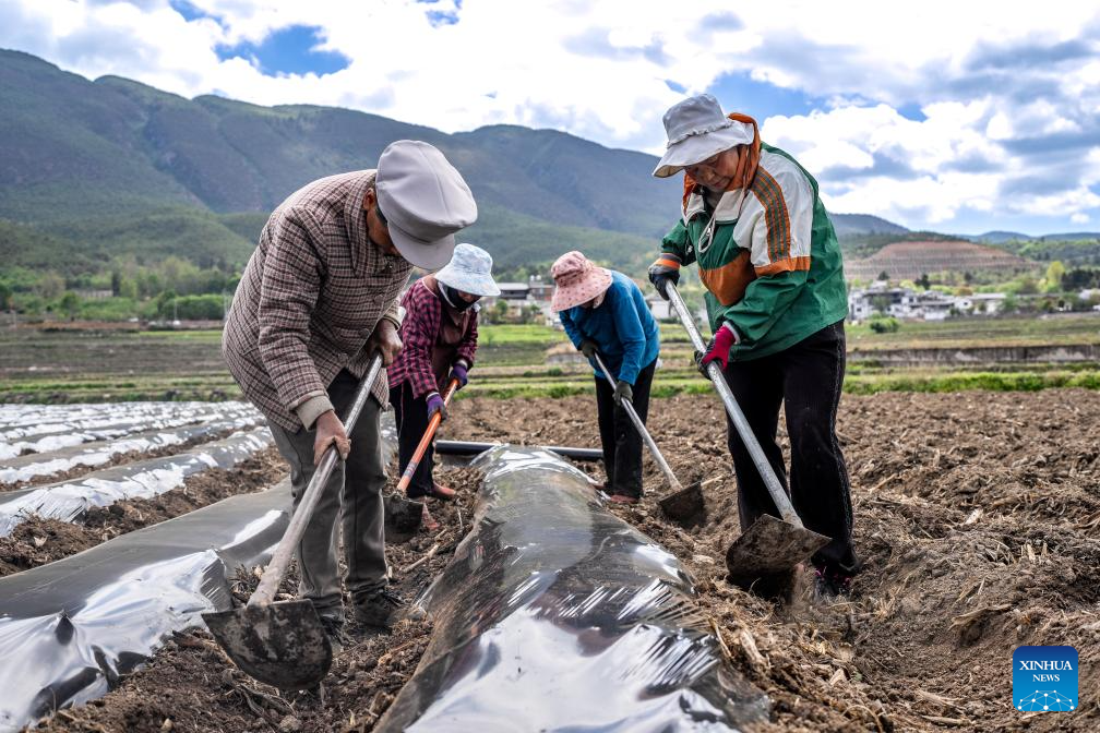 Villagers work in the field in Beilong Village of Shaxi Town, Jianchuan County, southwest China's Yunnan Province, April 20, 2025. A remote town in Jianchuan County, Shaxi was once an important trading hub for tea, herbs, silks and salt on the ancient Tea Horse Road, a trade route dating back to the Tang Dynasty (618-907). (Xinhua/Liu Lianfen)