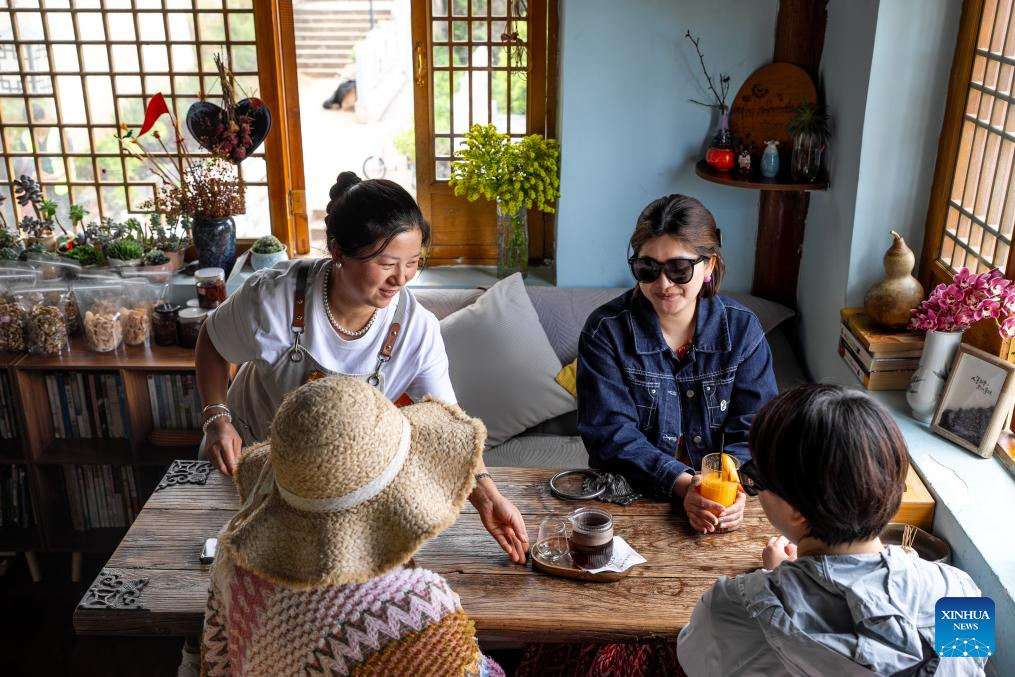 A villager serves coffee to tourists at Hualong Village of Shaxi Town, Jianchuan County, southwest China's Yunnan Province, April 20, 2025. A remote town in Jianchuan County, Shaxi was once an important trading hub for tea, herbs, silks and salt on the ancient Tea Horse Road, a trade route dating back to the Tang Dynasty (618-907). (Xinhua/Hu Chao)