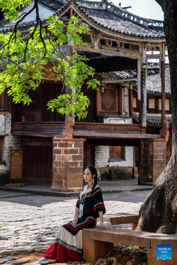 A tourist poses for a photo in front of an ancient stage at Sideng Village of Shaxi Town, Jianchuan County, southwest China's Yunnan Province, April 21, 2025. A remote town in Jianchuan County, Shaxi was once an important trading hub for tea, herbs, silks and salt on the ancient Tea Horse Road, a trade route dating back to the Tang Dynasty (618-907). (Xinhua/Hu Chao)