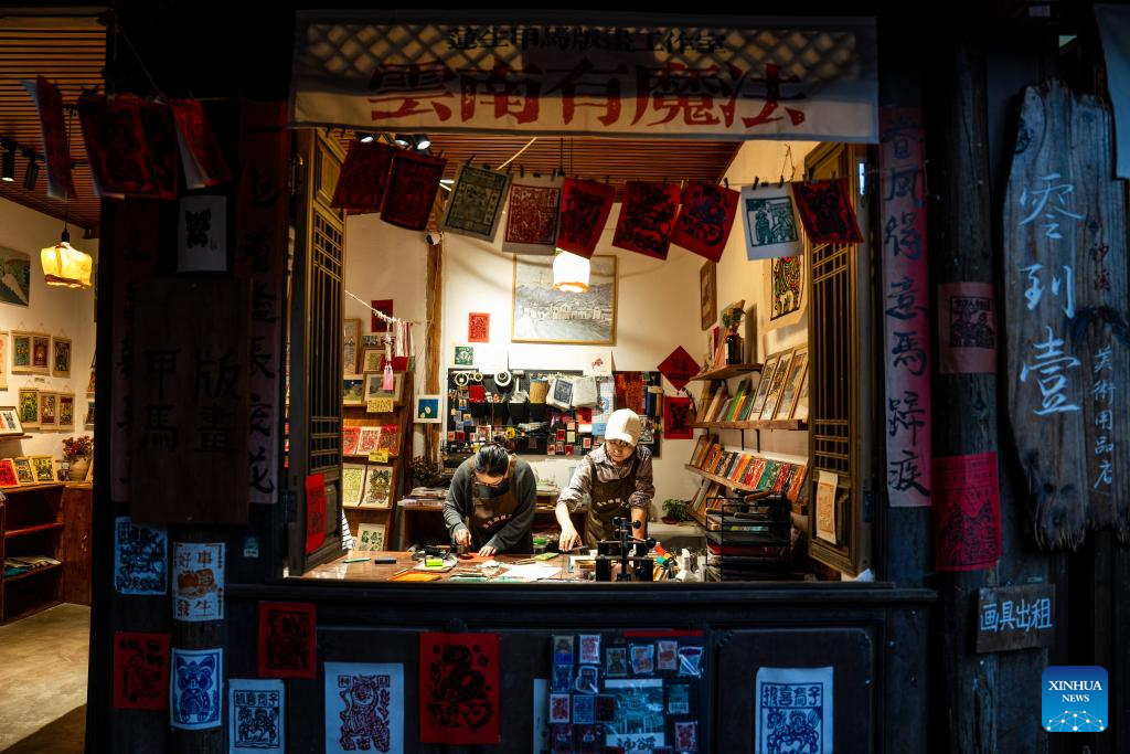 A tourist (L) tries to make a piece of local traditional woodblock print known as Jiama at Sideng Village of Shaxi Town, Jianchuan County, southwest China's Yunnan Province, April 18, 2025. (Xinhua/Hu Chao)