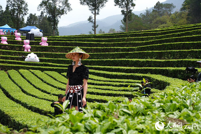 A model wearing ethnic attire walks the runway in a tea garden in Mengsa town, Gengma Dai and Wa Autonomous County, Lincang city, southwest China's Yunnan Province. (People's Daily Online/Zeng Zhihui)