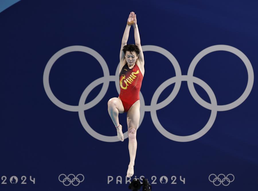 Chen Yiwen of China competes during the women's 3m springboard final of diving at the Paris 2024 Olympic Games in Saint-Denis, France, Aug. 9, 2024. (Xinhua/Zhang Yuwei)