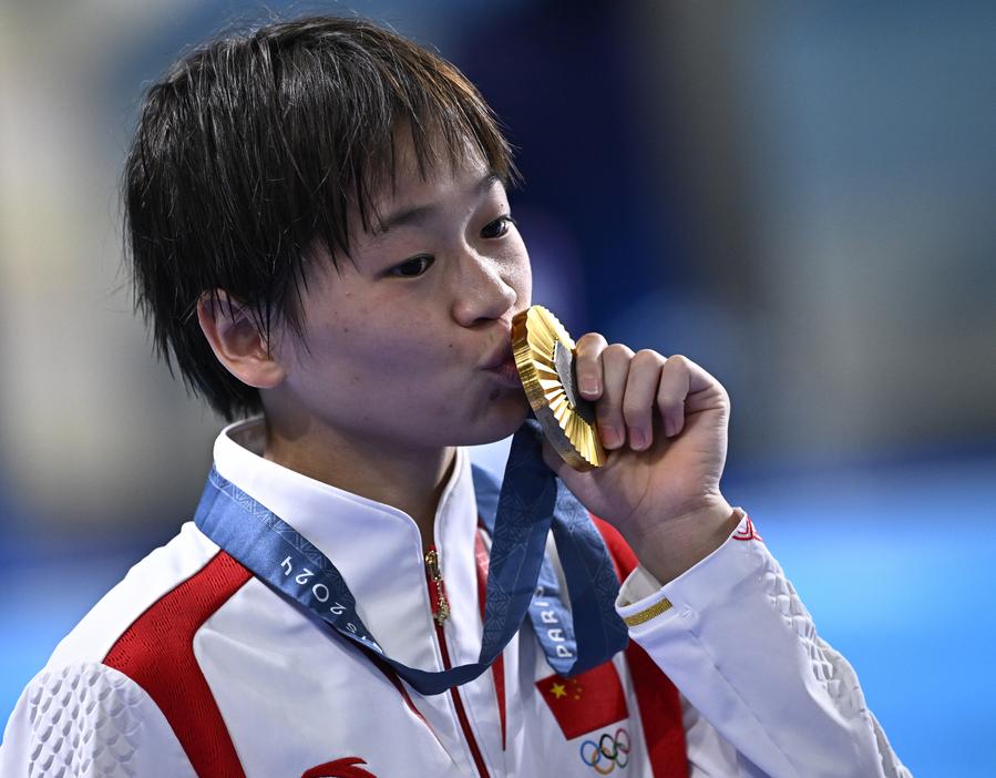 Gold medalist Quan Hongchan of China celebrates during the awarding ceremony after the women's 10m platform final of diving at the Paris 2024 Olympic Games in Saint-Denis, France, Aug. 6, 2024. (Xinhua/Wang Peng)