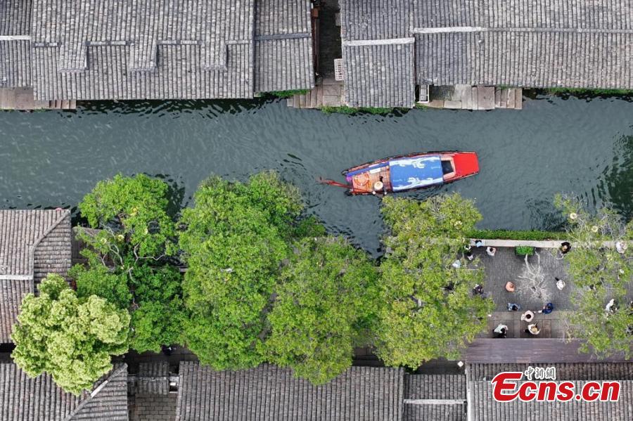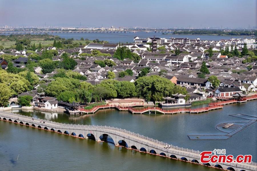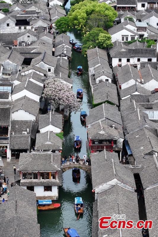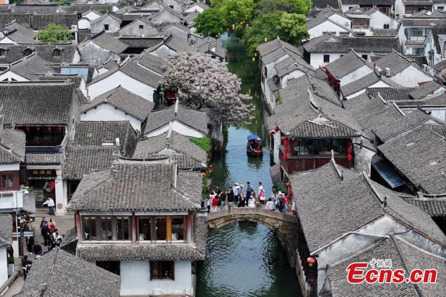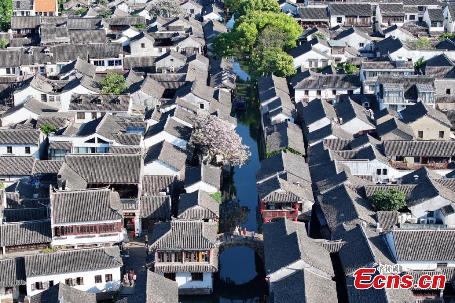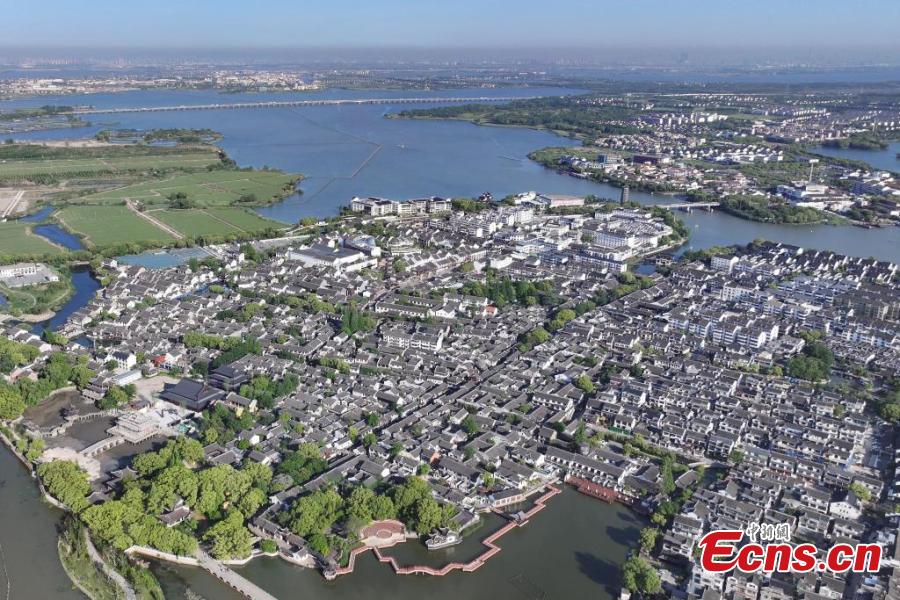 An aerial view of Zhouzhuang, a renowned water town in east China's Jiangsu Province, April 26, 2025. (China News Service/Yang Bo)