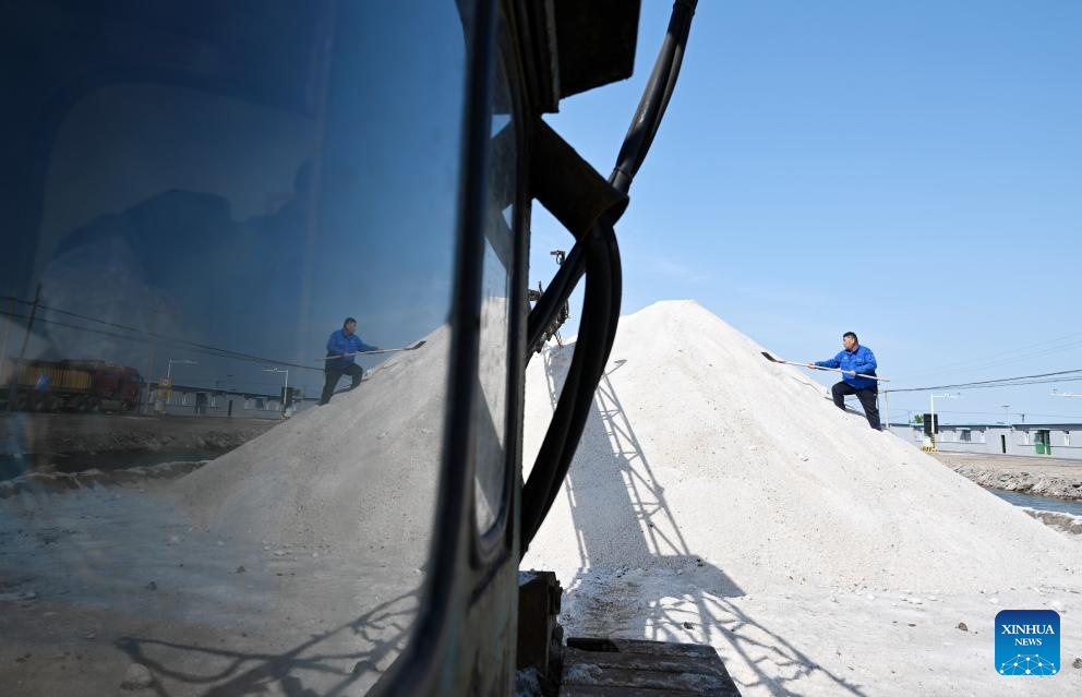 In recent days, workers of Tianjin Changlu Haijing Group Co., Ltd. have been busy harvesting salt in its 250,000 mu (about 16,700 hectares) of salt flats. The spring harvest of salt usually starts from mid-to-late March to June, depending on the weather condition. (Xinhua/Zhao Zishuo)