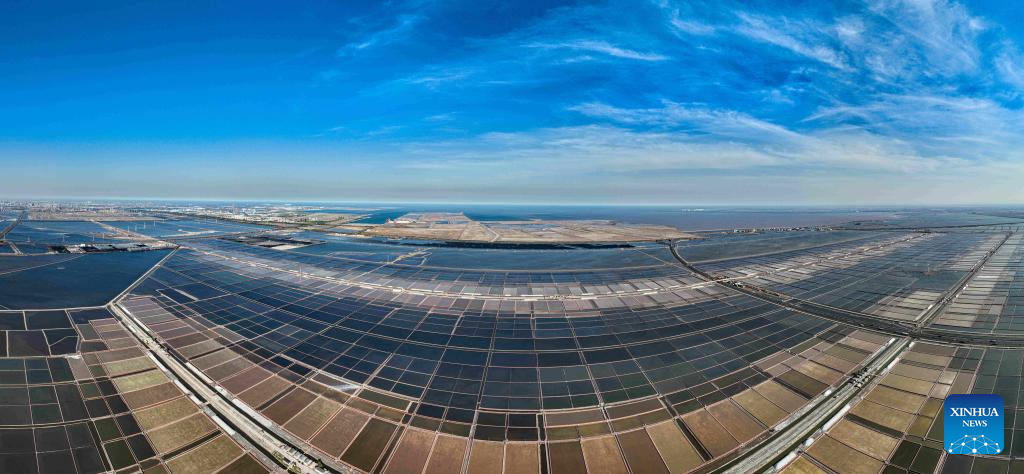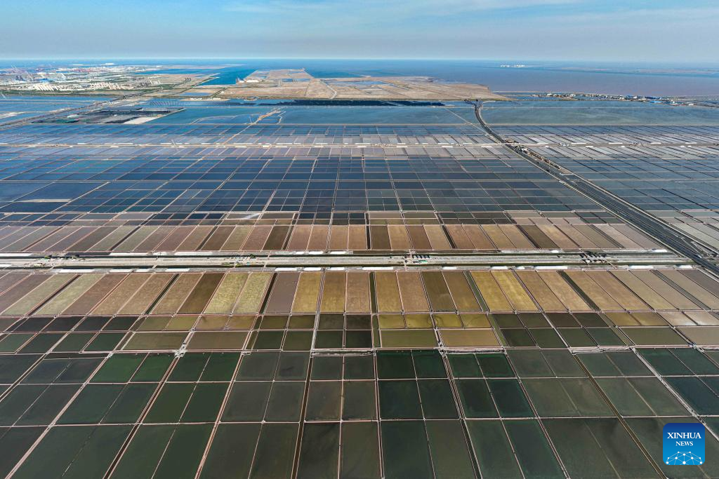 An aerial drone photo taken on April 27, 2025 shows salt flats of Tianjin Changlu Haijing Group Co., Ltd. in Tianjin, north China.