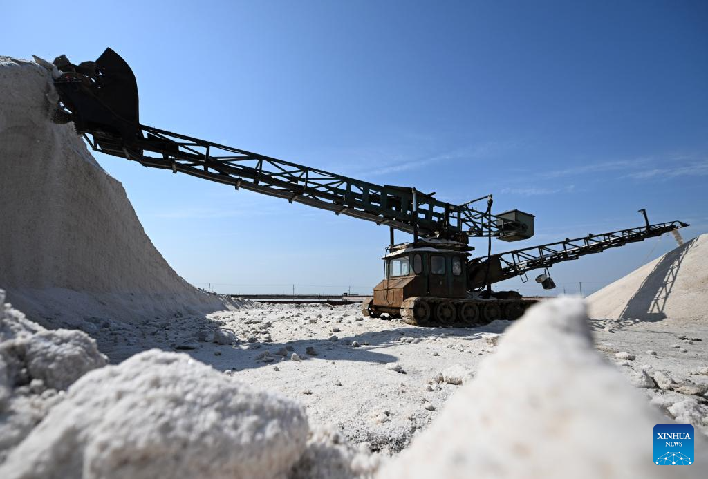 A machine transfers harvested salt in a salt flat of Tianjin Changlu Haijing Group Co., Ltd. in Tianjin, north China, April 27, 2025.