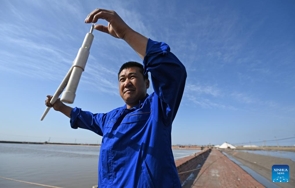 A worker measures the content of brine in a salt flat of Tianjin Changlu Haijing Group Co., Ltd. in Tianjin, north China, April 27, 2025.