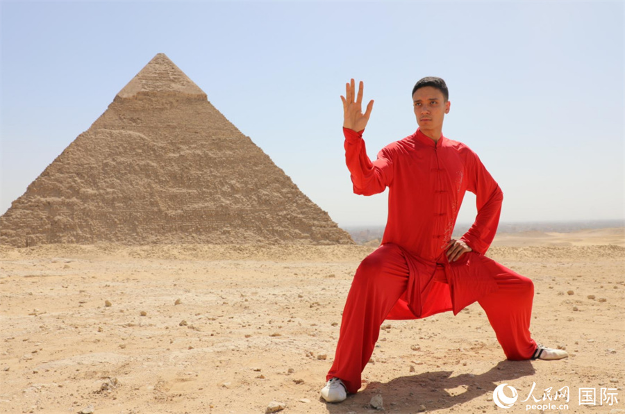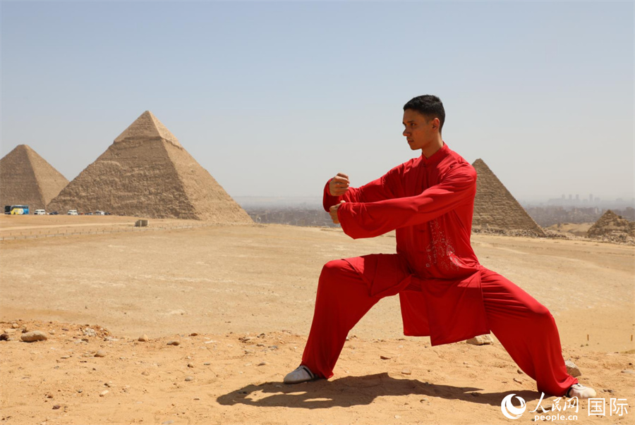 An Egyptian practices Tai Chi at foot of the Giza Pyramids in Egypt. (People's Daily Online/Hind Fathi Muhammad)