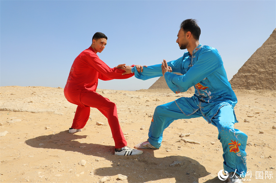 Two Egyptians practice Tai Chi at foot of the Giza Pyramids in Egypt. (People's Daily Online/Hind Fathi Muhammad)
