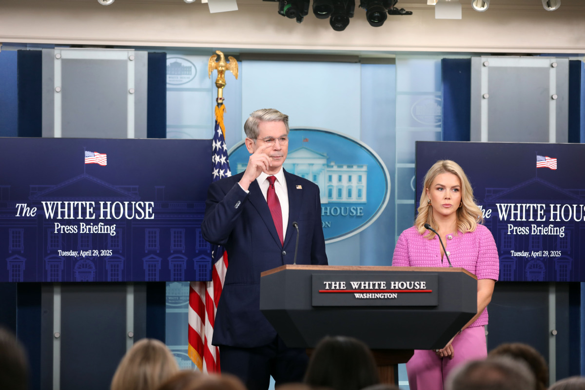 US Treasury Secretary Scott Bessent (left) says at a White House briefing on Tuesday that "certainty is not necessarily a good thing in negotiating." US President Donald Trump reached the 100-day mark of his presidency on Tuesday. Photo by Zhao Huanxin / China Daily
