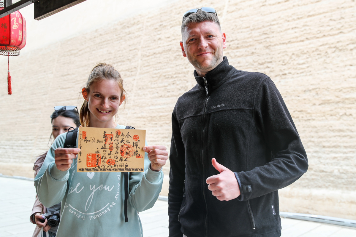 Two German tourists on a trip to Jiayuguan, Gansu province, on Sunday. [Photo/Xinhua]