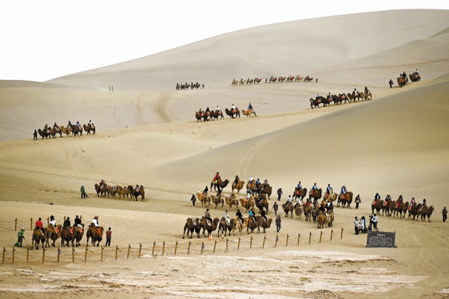 Tourists ride camels at a scenic area in Dunhuang, Gansu province, on Saturday. [ZHANG XIAOLIANG/FOR CHINA DAILY]