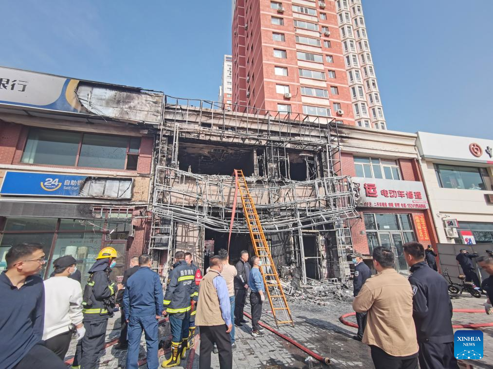 This photo taken on April 29, 2025 shows the site of a restaurant fire in Liaoyang, northeast China's Liaoning Province. A restaurant fire broke out at 12:25 p.m. Tuesday in the city of Liaoyang, northeast China's Liaoning Province. The fire had killed 22 people and injured three others as of 2 p.m. (Xinhua)