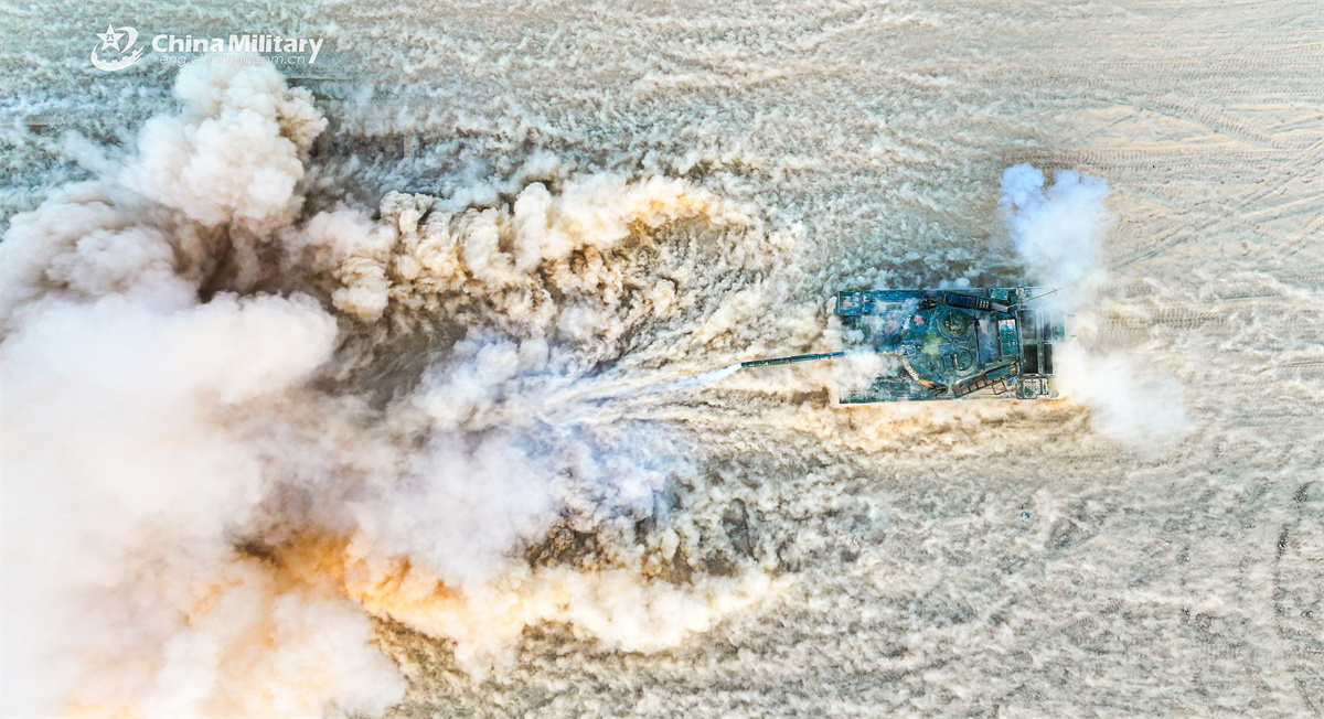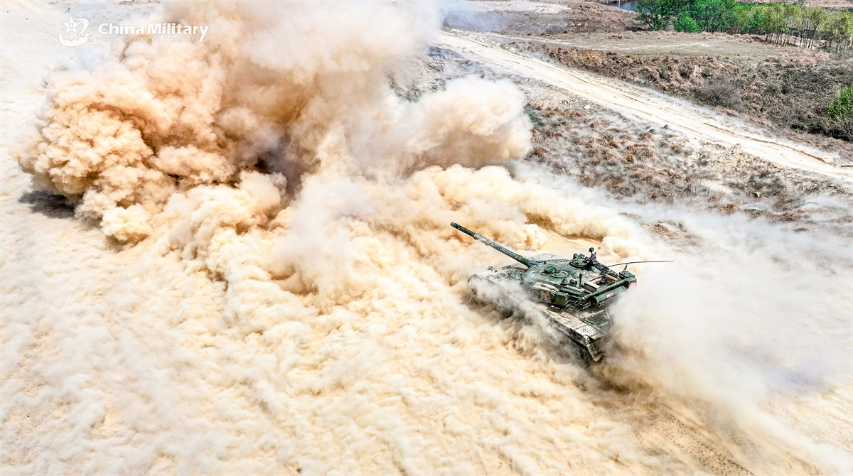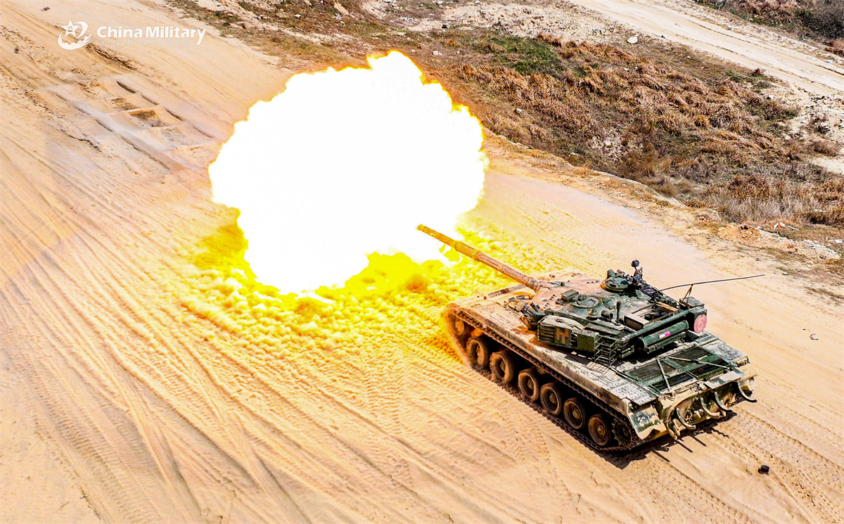 A Type 96 tank assigned to a tank detachment of a brigade under the Chinese PLA Army shoots at the mock target while moving during a live-fire shooting training exercise on April 19, 2025. (eng.chinamil.com.cn/Photo by Hu Qingfeng)