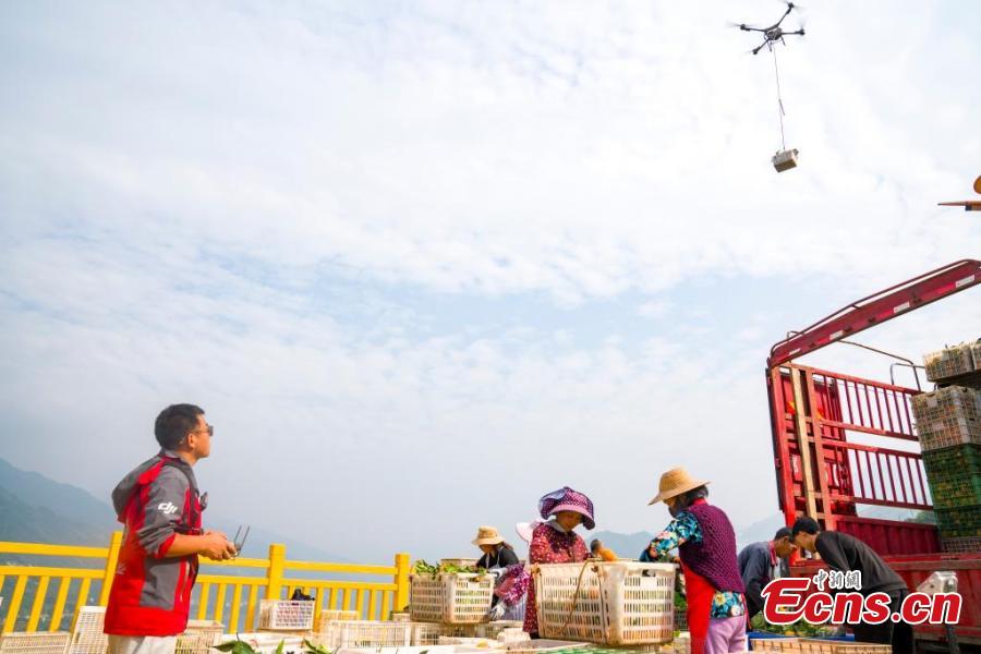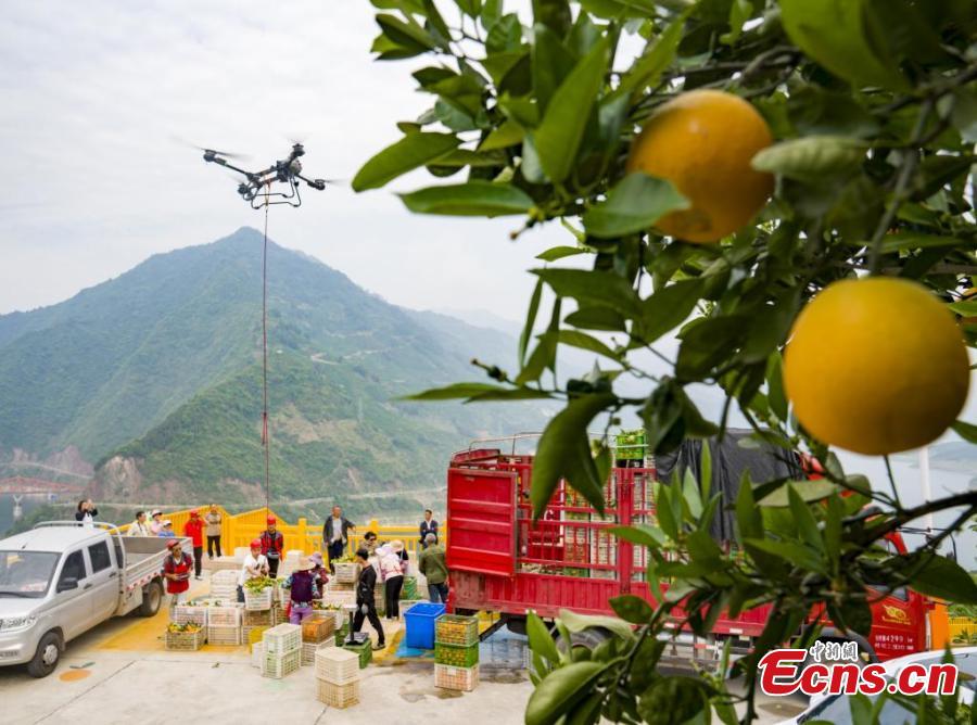 Drones transport navel oranges at a farmland in Zigui, central China's Hubei Province. (Photo: China News Service/Zhou Shiwei)
