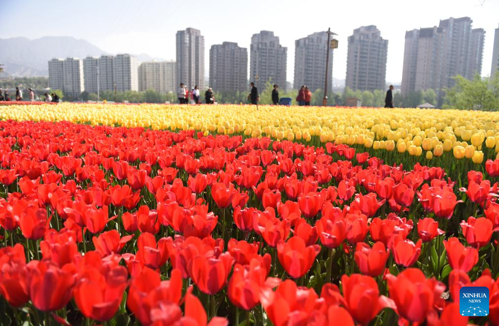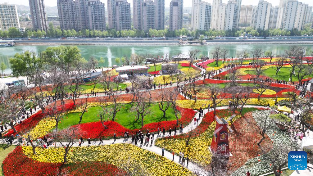 Tourists visit tulips along the Yellow River in Yongjing County, northwest China's Gansu Province, April 30, 2025. Visitor numbers at nationwide tourist attractions have risen as the May Day holiday approaches.