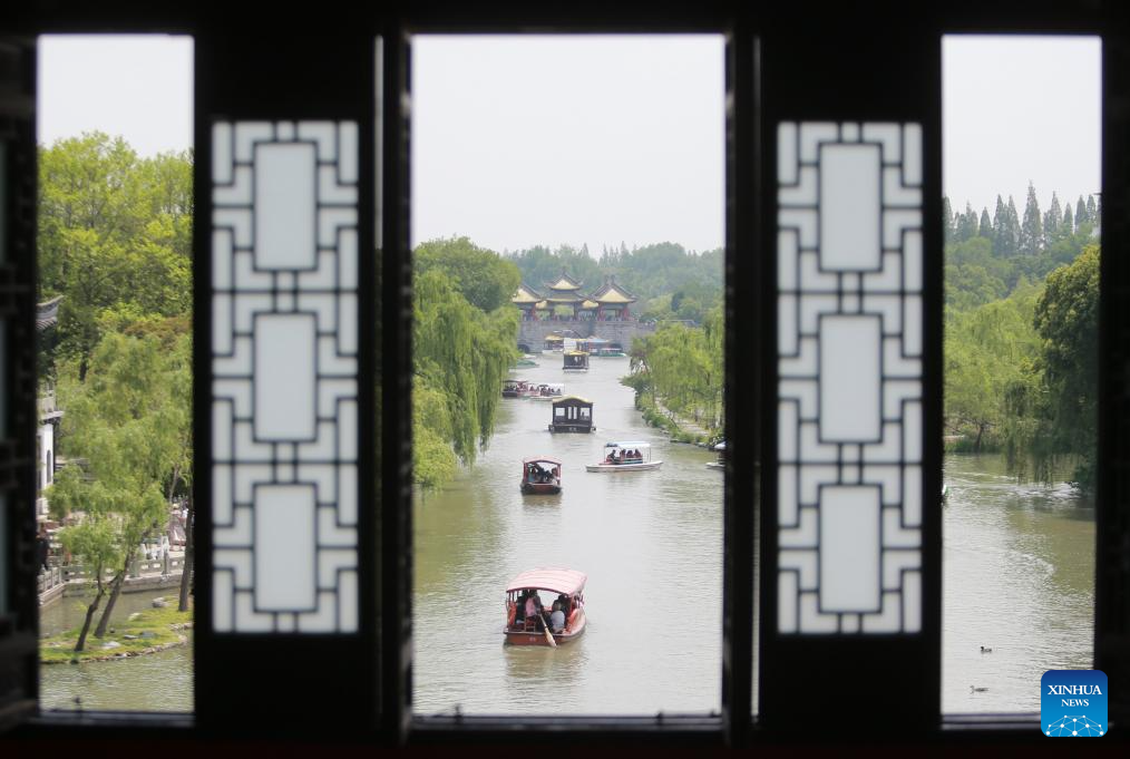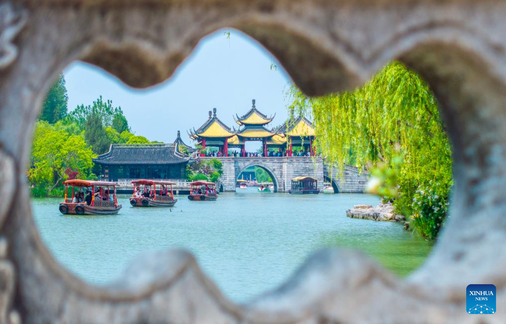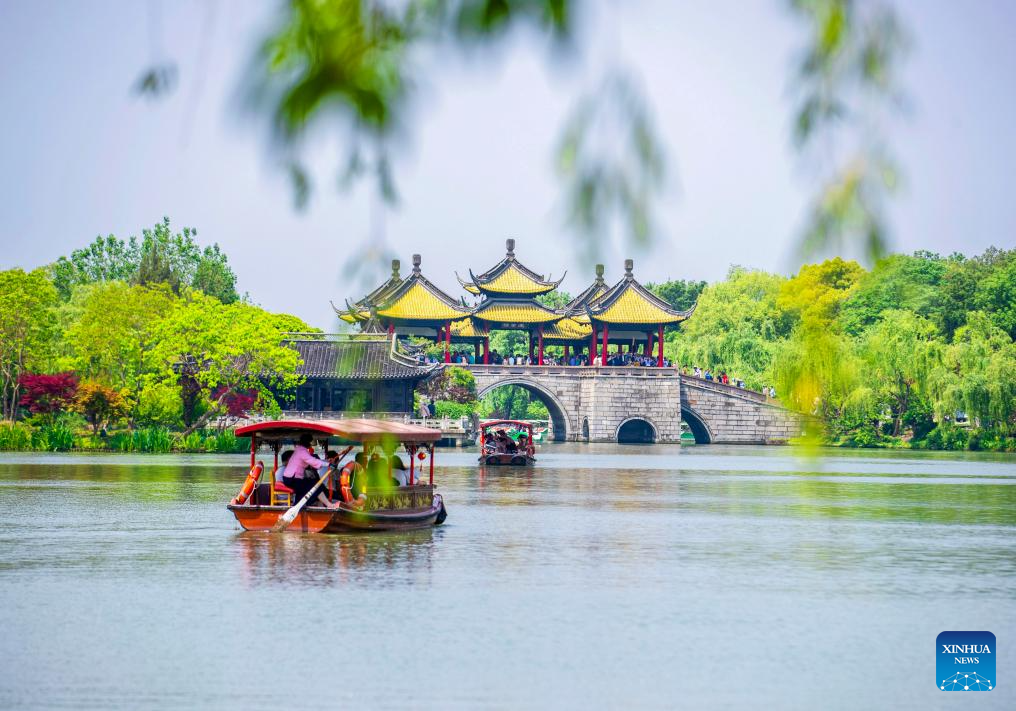 This photo taken on April 30, 2025 shows tourists visiting Slender West Lake scenic spot in Yangzhou, east China's Jiangsu Province. Visitor numbers at nationwide tourist attractions have risen as the May Day holiday approaches.