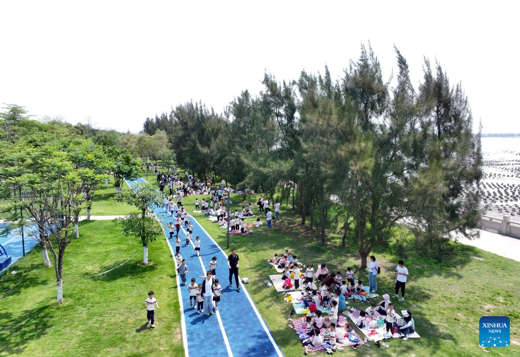 An aerial drone photo taken on April 30, 2025 shows children visiting a seaside park in Quanzhou, southeast China's Fujian province. Visitor numbers at nationwide tourist attractions have risen as the May Day holiday approaches.