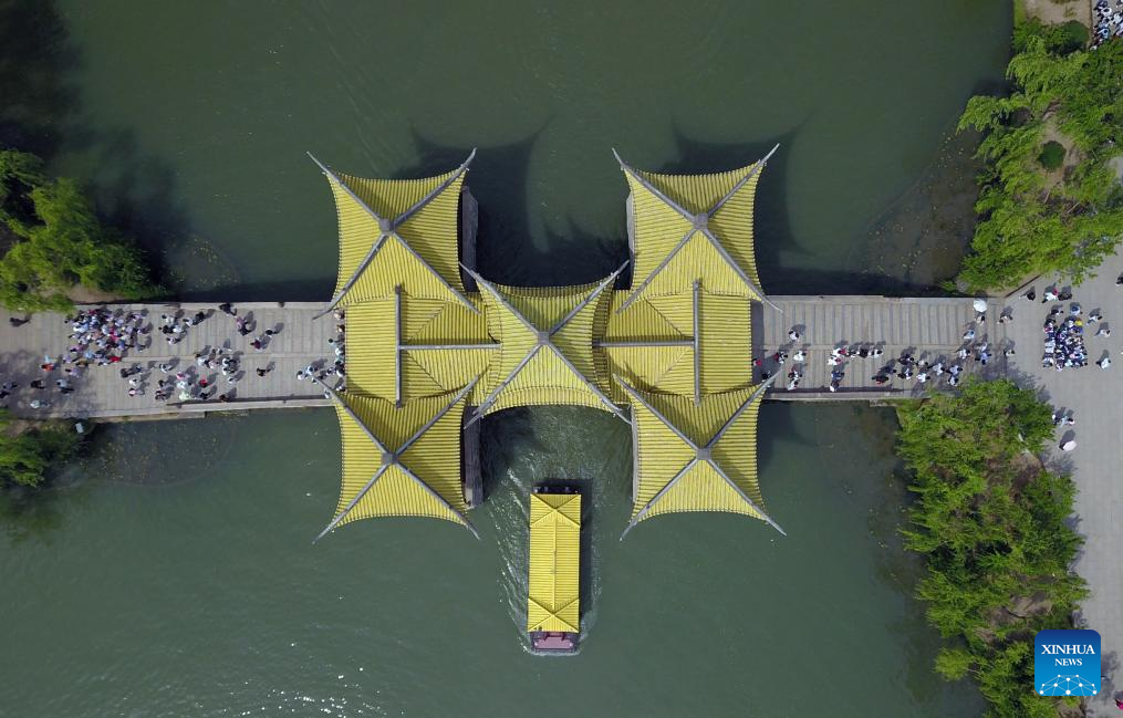 An aerial photo taken on April 30, 2025 shows tourists visiting Slender West Lake scenic spot in Yangzhou, east China's Jiangsu Province. Visitor numbers at nationwide tourist attractions have risen as the May Day holiday approaches.