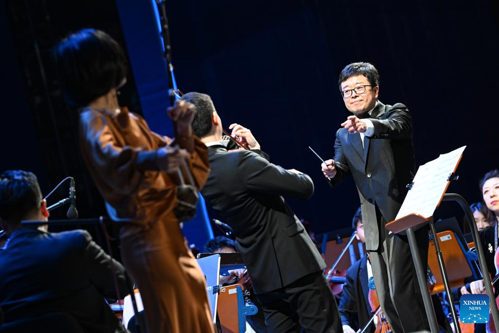 Conductor Jin Ye from Beijing Symphony Orchestra conducts during a concert of the 5th Taihu Jazz Festival in Tongzhou District of Beijing, capital of China, April 30, 2025. The 5th Taihu Jazz Festival opened in Tongzhou District of Beijing on Wednesday. (Xinhua/Chen Zhonghao)