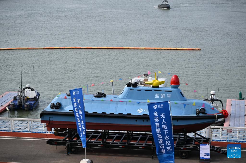 The "Blue Whale," a cutting-edge high-speed submersible unmanned surface vessel, is pictured in Zhuhai, south China's Guangdong Province, April 29, 2025.