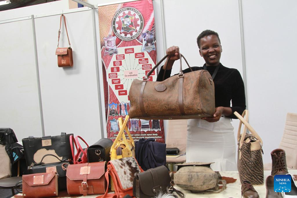 A Zimbabwean woman sells leather products at a trade fair in Bulawayo, Zimbabwe, on April 25, 2025. (Xinhua/Tafara Mugwara)