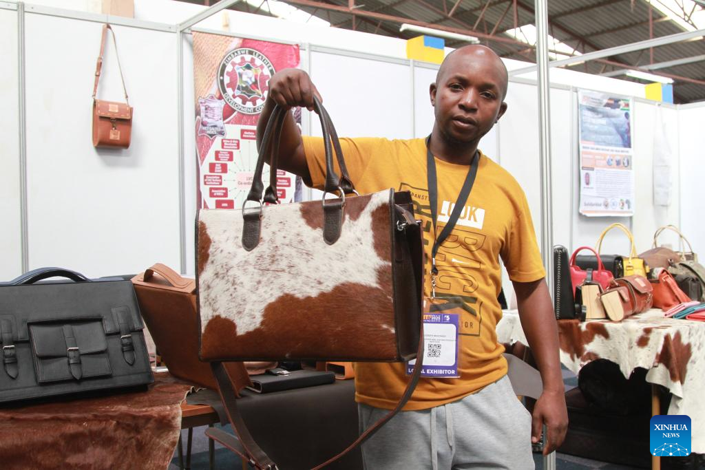 A Zimbabwean man shows a leather bag at a trade fair in Bulawayo, Zimbabwe, on April 25, 2025. (Xinhua/Tafara Mugwara)