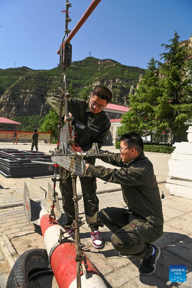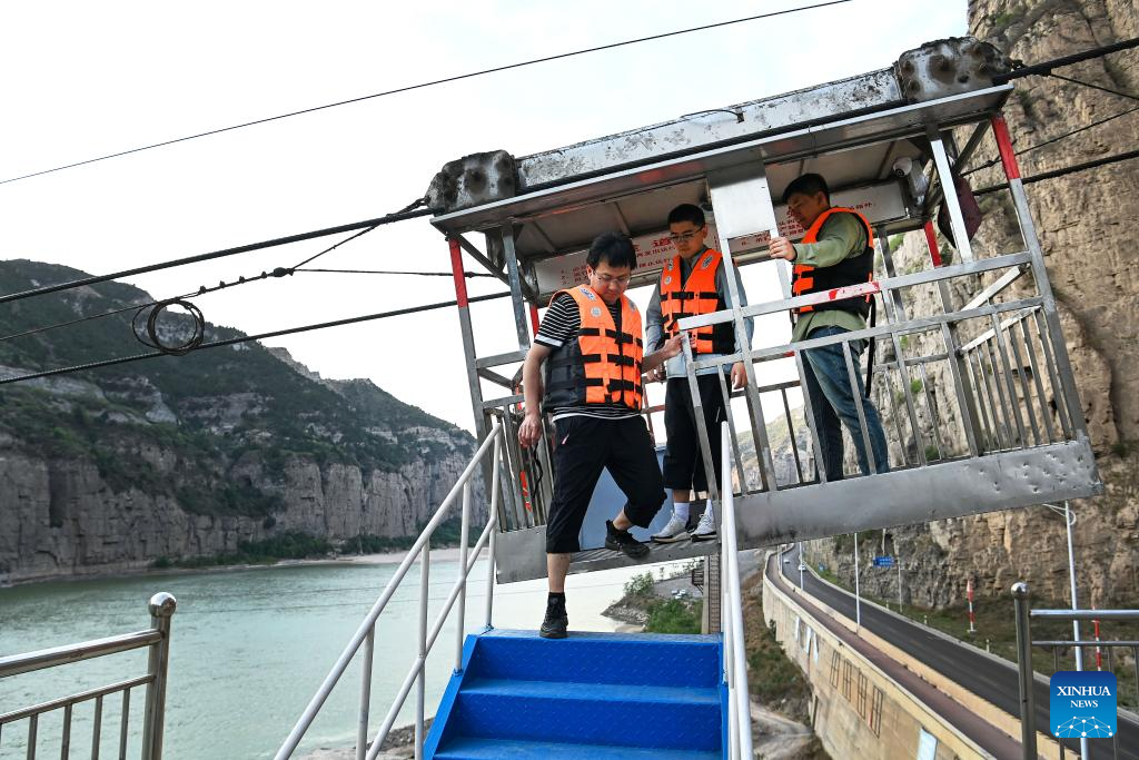 Employee Li Chaohua (C) and his colleagues prepare to take the cable car to buy daily necessities at the Longmen Hydrological Station in Hancheng City of northwest China's Shaanxi Province, April 28, 2025. (Xinhua/Zou Jingyi)