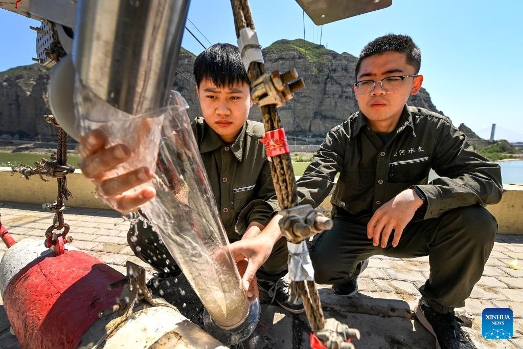Employees Huo Mingchong (L) and Zhang Yang set a sample taking utensil at the Longmen Hydrological Station in Hancheng City of northwest China's Shaanxi Province, April 28, 2025. (Xinhua/Zou Jingyi)