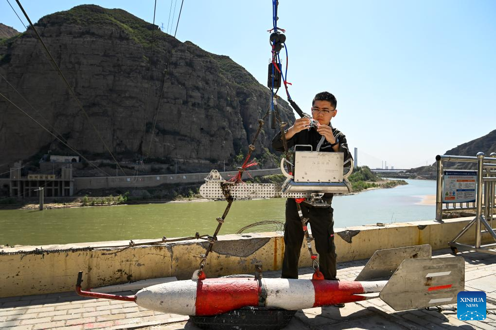 Employee Zhang Yang sets a sample taking utensil at the Longmen Hydrological Station in Hancheng City of northwest China's Shaanxi Province, April 28, 2025. (Xinhua/Zou Jingyi)