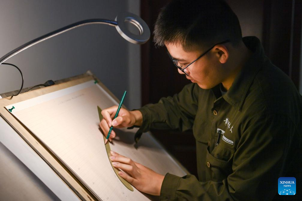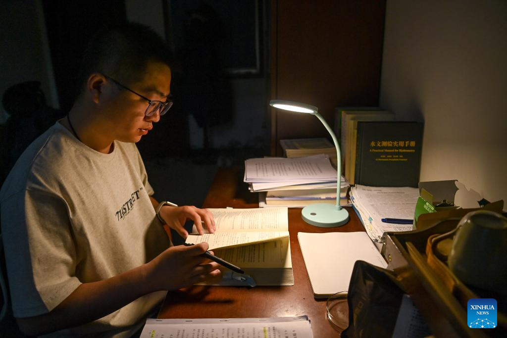 Employee Huo Mingchong learns hydrological knowledge after work at his dormitory at the Longmen Hydrological Station in Hancheng City of northwest China's Shaanxi Province, April 28, 2025. (Xinhua/Zou Jingyi)