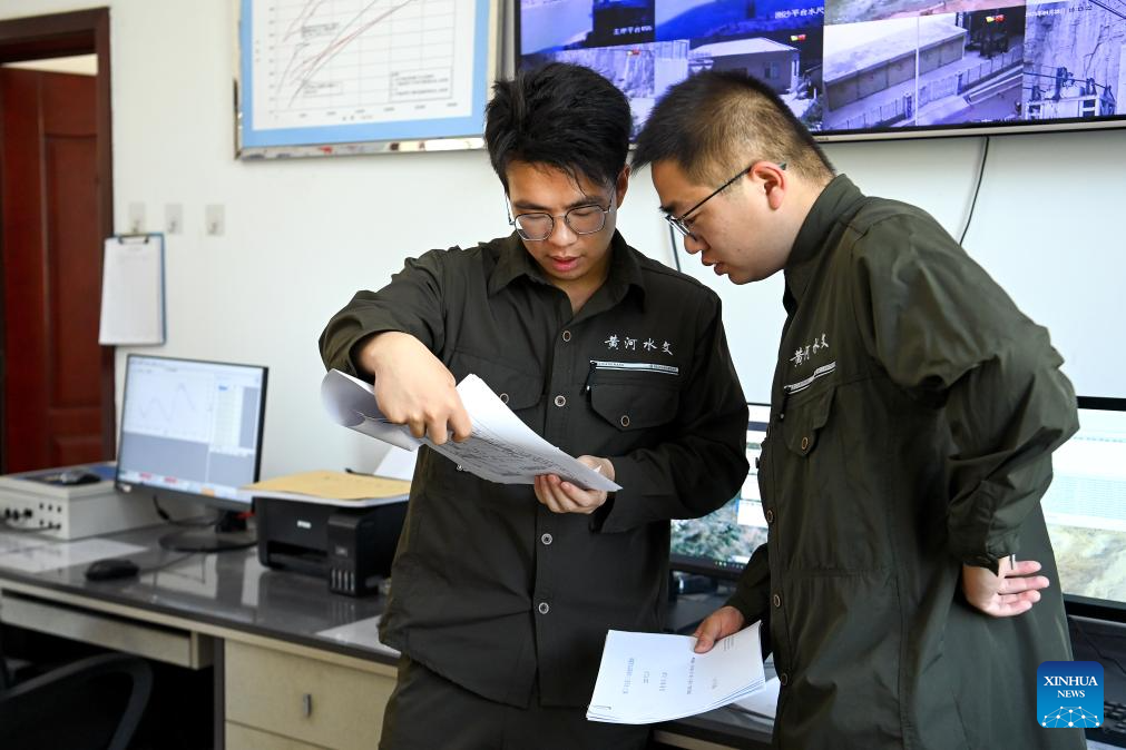 Employees Gan Yuan (L) and Huo Mingchong check hydrological data at the Longmen Hydrological Station in Hancheng City of northwest China's Shaanxi Province, April 28, 2025. (Xinhua/Zou Jingyi)
