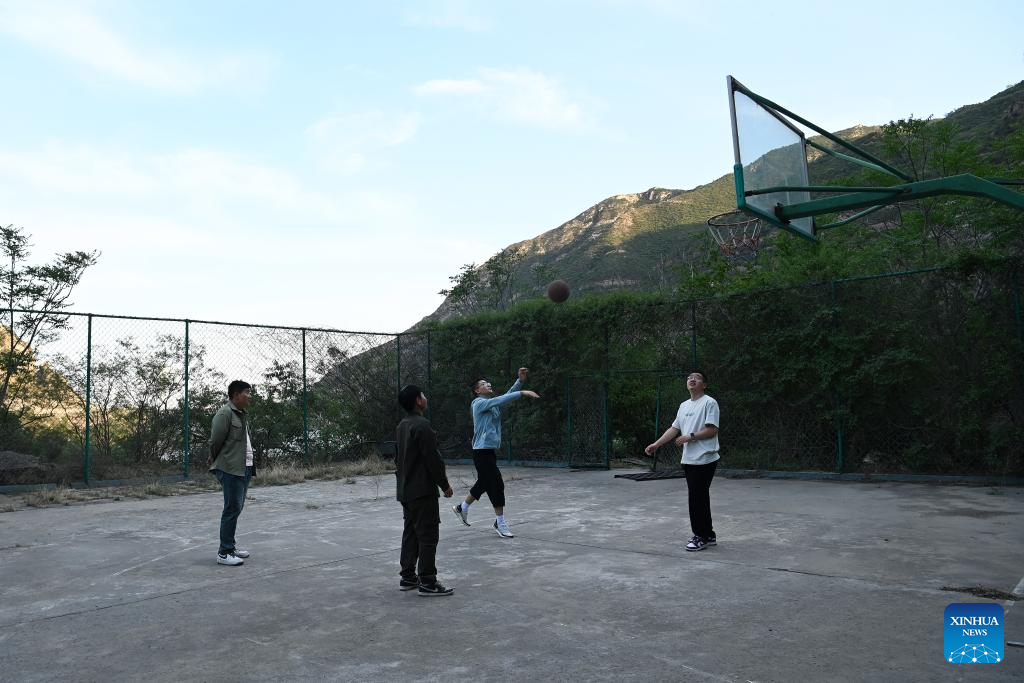 Employees play basketball after work at the Longmen Hydrological Station in Hancheng City of northwest China's Shaanxi Province, April 28, 2025.(Xinhua/Zou Jingyi)