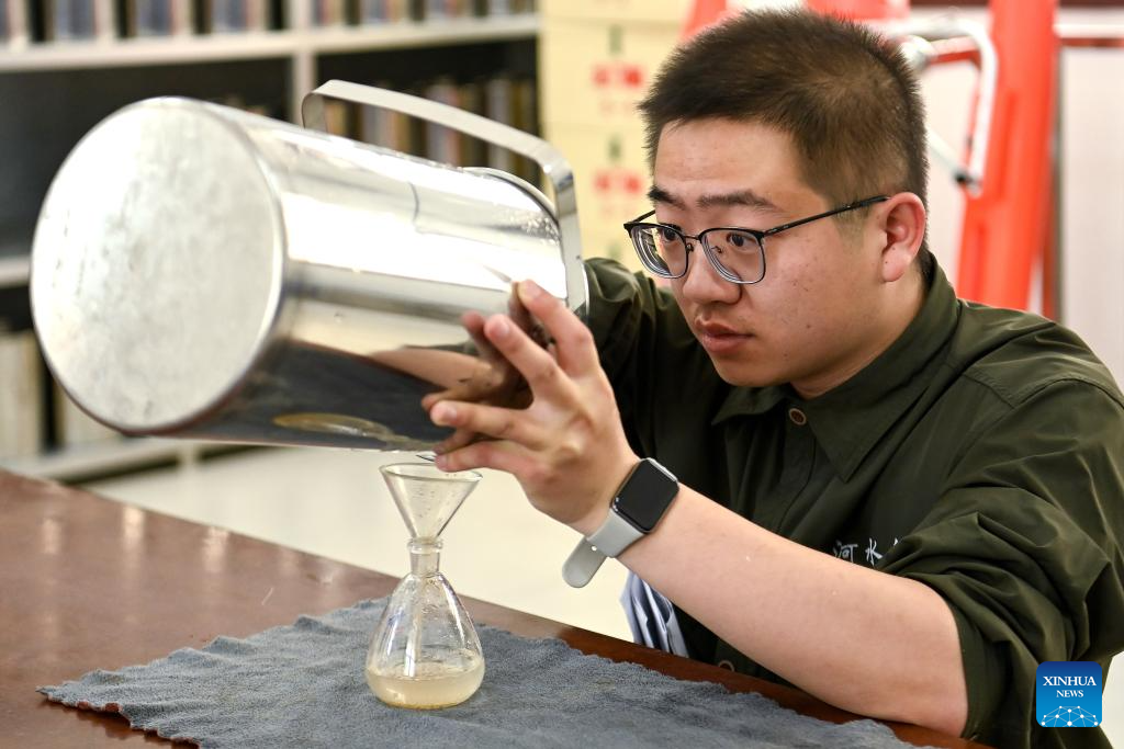 Employee Huo Mingchong measures the sand content in water sample at the Longmen Hydrological Station in Hancheng City of northwest China's Shaanxi Province, April 28, 2025. (Xinhua/Zou Jingyi)