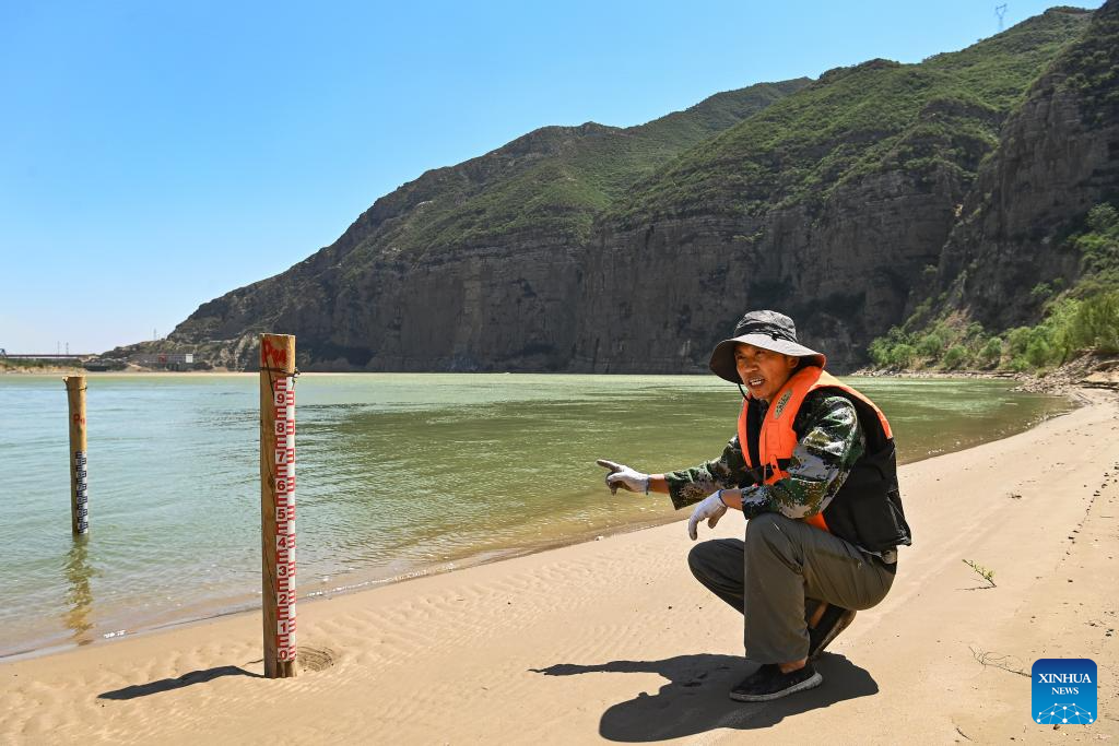 Employee Bai Yushan checks the water gauges at the Longmen Hydrological Station in Hancheng City of northwest China's Shaanxi Province, April 28, 2025. (Xinhua/Zou Jingyi)