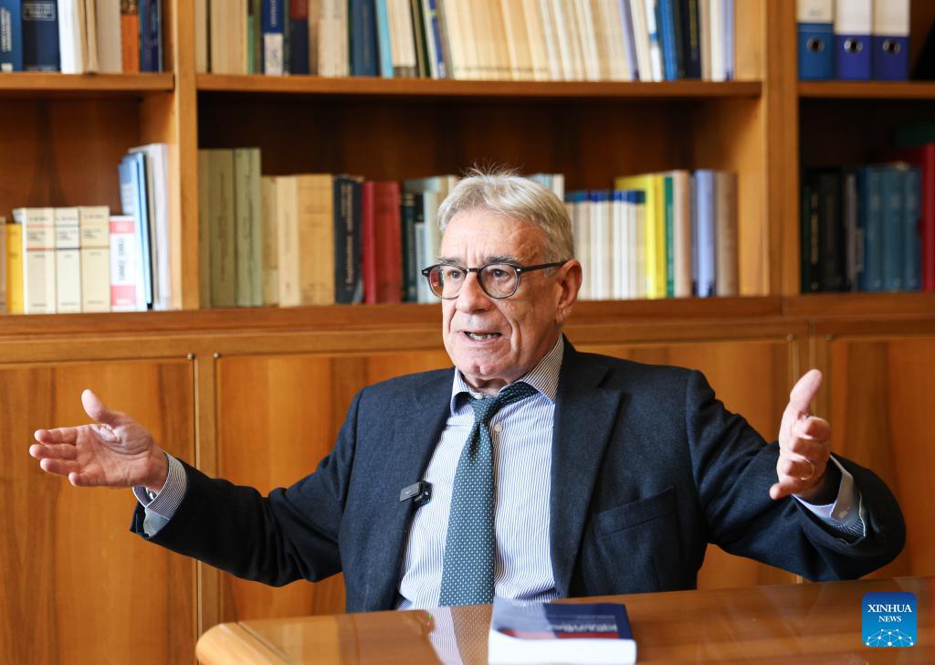 Prof. Oliviero Diliberto, dean of the faculty of law at Sapienza University of Rome, speaks during an interview with Xinhua at his office in Sapienza University of Rome, Italy, April 23, 2025. (Xinhua/Li Jing)