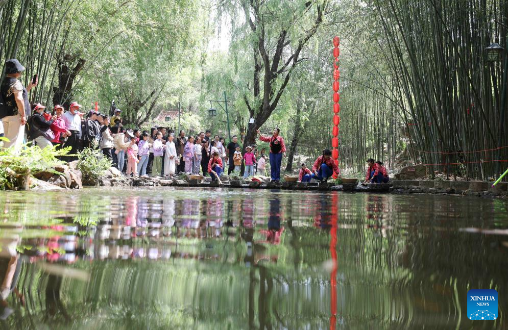 (250504) -- LINYI, May 4, 2025 (Xinhua) -- Tourists watch a folk art show in Zhuquan Village of Yinan County, Linyi City, east China's Shandong Province, May 4, 2025. People across China enjoy the ongoing May Day holiday in various ways. (Photo by Wang Yanbing/Xinhua)