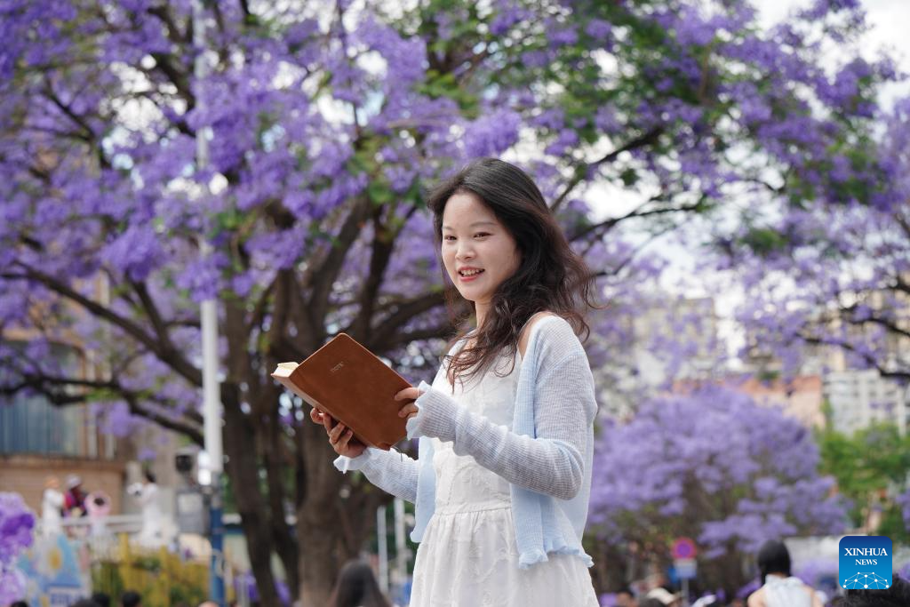 (250504) -- KUNMING, May 4, 2025 (Xinhua) -- A girl poses for a photo with blooming jacaranda trees in Kunming, southwest China's Yunnan Province, May 4, 2025. People across China enjoy the ongoing May Day holiday in various ways. (Xinhua/Gao Yongwei)
