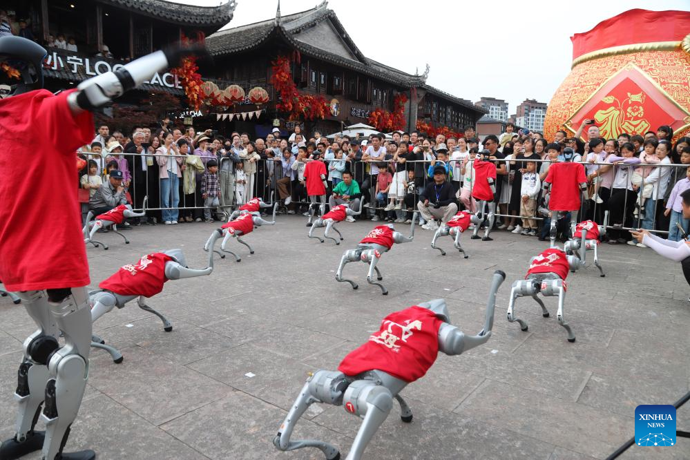 (250504) -- TAIZHOU, May 4, 2025 (Xinhua) -- Tourists watch a robot show at Taizhou City, east China's Zhejiang Province, May 4, 2025. People across China enjoy the ongoing May Day holiday in various ways. (Photo by Jiang Youqing/Xinhua)