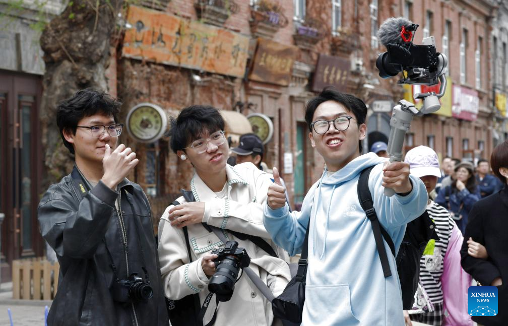 (250504) -- HARBIN, May 4, 2025 (Xinhua) -- Vloggers shoot a video at a historical cultural area in Harbin, northeast China's Heilongjiang Province, May 1, 2025. People across China enjoy the ongoing May Day holiday in various ways. (Photo by Zhang Shu/Xinhua)