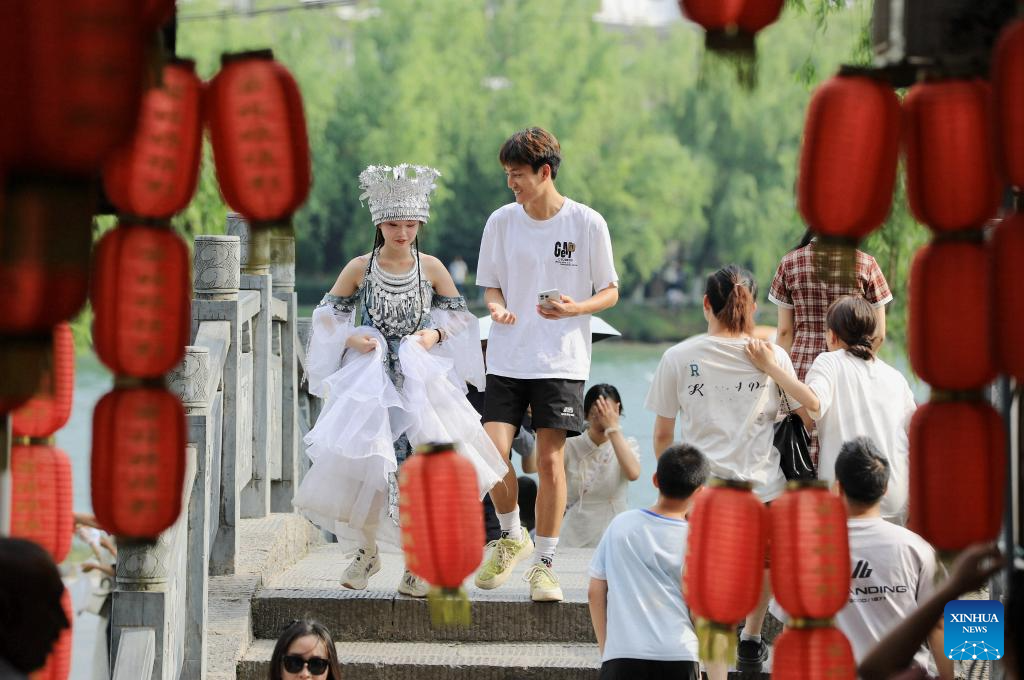 (250504) -- QIANDONGNAN, May 4, 2025 (Xinhua) -- People visit an ancient town in Qiandongnan Miao and Dong Autonomous Prefecture, southwest China's Guizhou Province, May 3, 2025. People across China enjoy the ongoing May Day holiday in various ways. (Photo by Tai Shengzhi/Xinhua)