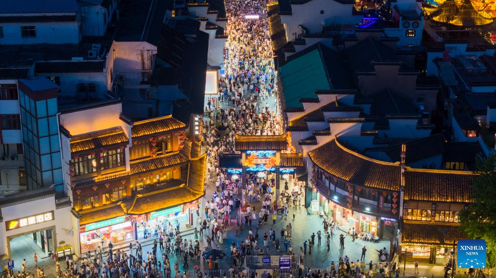 (250504) -- NANJING, May 4, 2025 (Xinhua) -- An aerial drone photo taken on May 3, 2025 shows tourists visiting the Fuzimiao scenic area in Nanjing, east China's Jiangsu Province. People across China enjoy the ongoing May Day holiday in various ways. (Photo by Yang Suping/Xinhua)